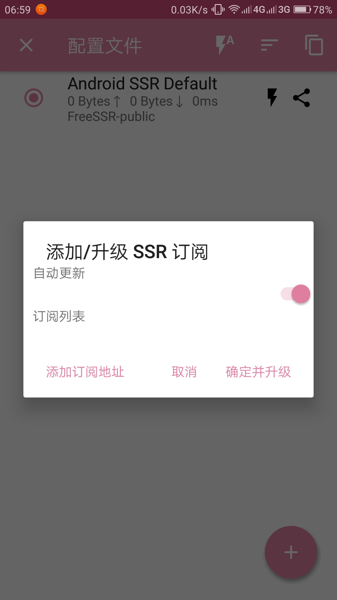 点击右下角的加号按钮,在弹出的选项中选择「添加/升级 SSR 订阅」。