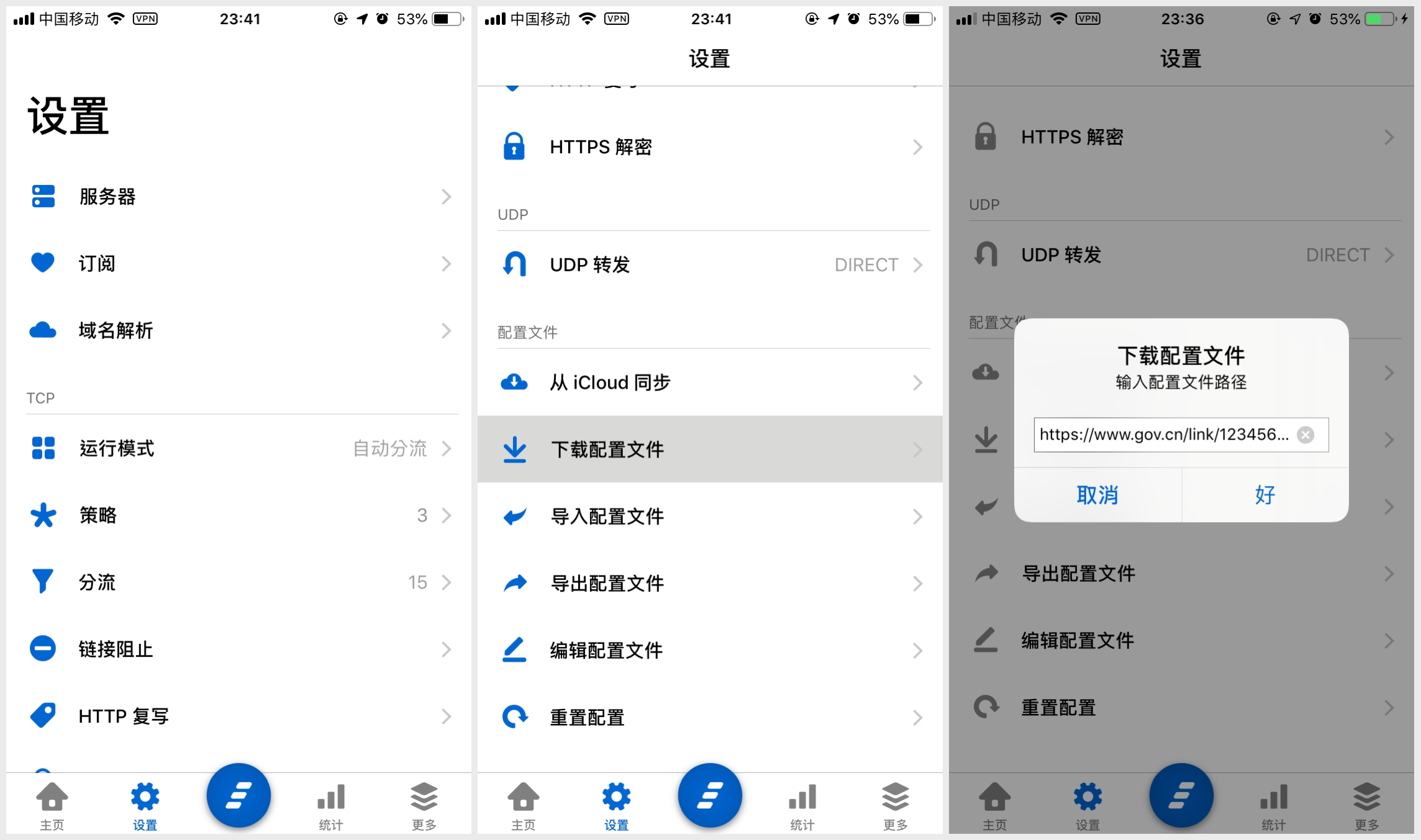 划动到下方,点击 下载配置文件,在弹出的输入框中粘贴上方 获取订阅 中您需要使用的订阅类型并保存。